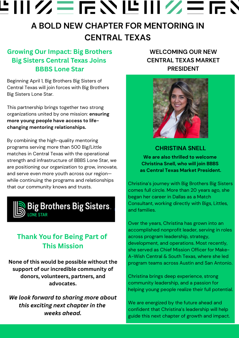 Big Brothers Big Sisters of Central Texas is entering a bold new chapter by joining BBBS Lone Star, expanding its reach and strengthening its impact for youth across the region. This partnership brings together two mission-driven organizations to serve more young people through life-changing mentoring relationships. As part of this transition, the organization also welcomes Christina Snell as Central Texas Market President, bringing deep experience and leadership to guide this next phase of growth.