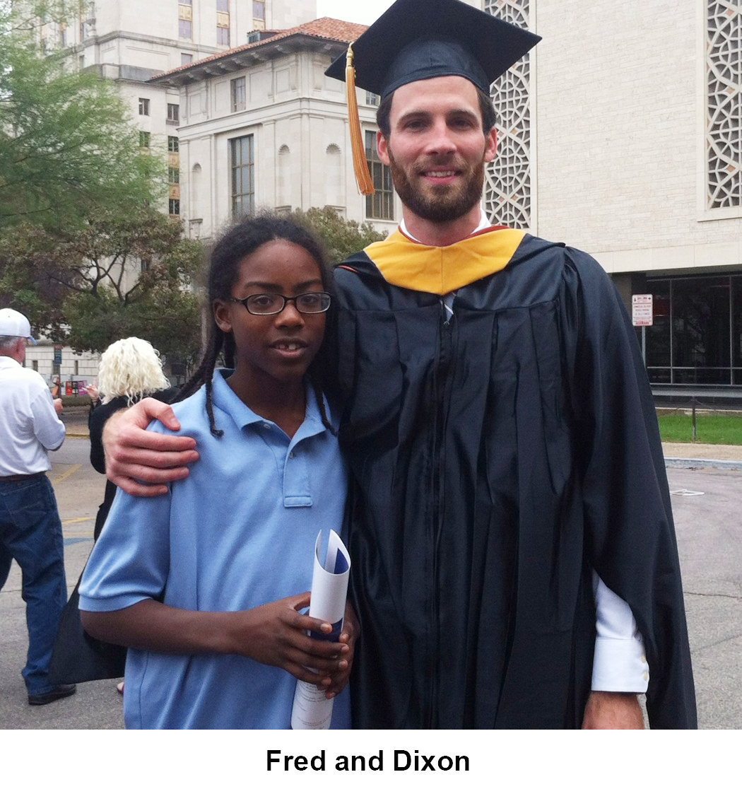 on at sporting events, played games together and helped him focus on his academics and future aspirations. Early in their match, Fred was in attendance when Dixon earned his Master’s degree from the University of Texas. This sparked a growing interest in higher education and Dixon and Vanessa recently cheered Fred on in turn as he walked across the stage to earn his high school diploma. Fred is now utilizing his BBBS scholarship as a freshman at Lamar Technical Institute in Beaumont.